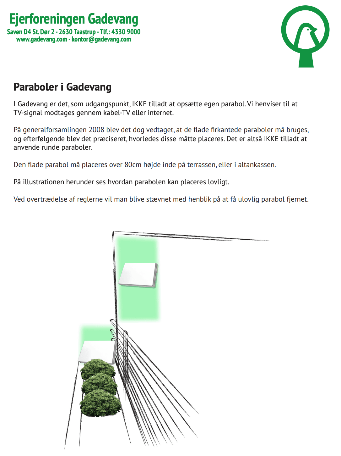 De er som udgangspunkt ikke tilladt i Gadevang, medmindre der er tale om en flad og firkantet parabol som beskrevet her: